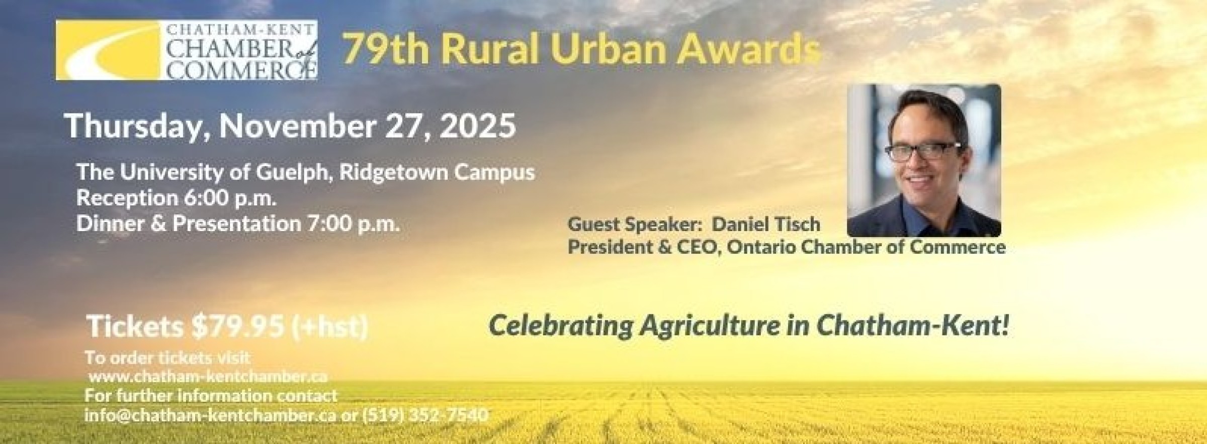 The Chatham-Kent Chamber of Commerce Rural Urban Awards celebrates the people and businesses who drive our agricultural community forward. These awards recognize outstanding innovation, growth, leadership, and contributions that strengthen Chatham-Kent's proud farming heritage and rural economy. Through this event, we honour those who cultivate success — from family farms and agri-businesses to the innovators shaping the future of agriculture.